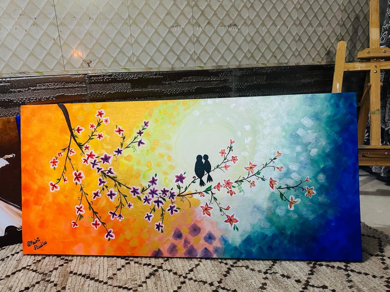 This hand-painted artwork represents love, peace, and unity through a gentle composition of blooming branches and two birds perched together. The smooth gradient background transitions beautifully across warm and cool tones, making it a calming yet visually rich piece.