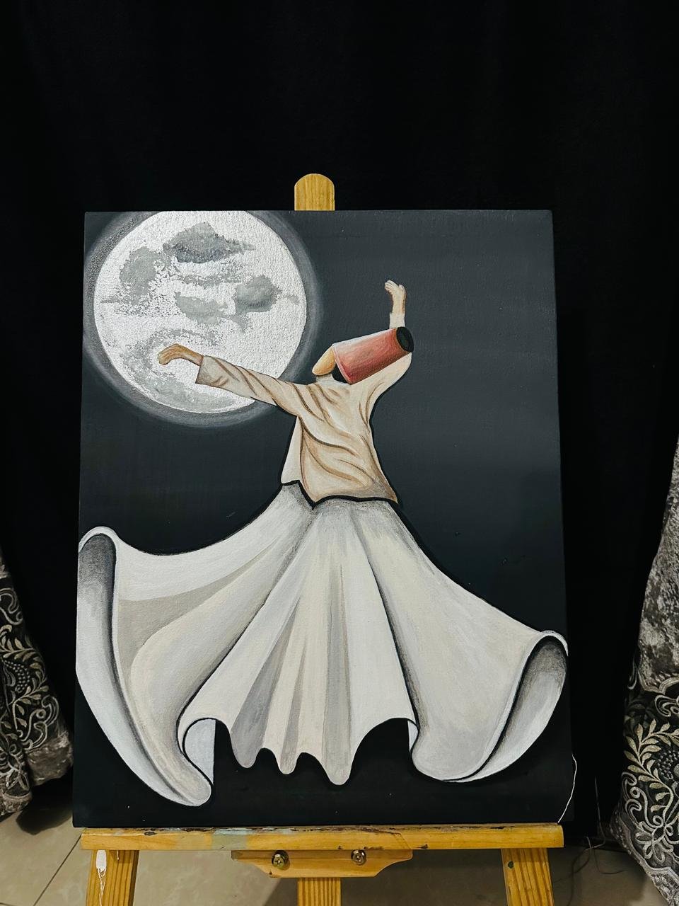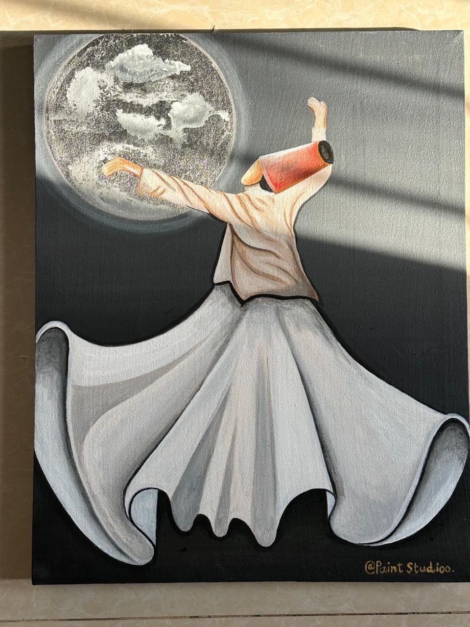 This hand-painted canvas portrays a whirling dervish illuminated by moonlight, representing spiritual awakening and surrender to divine love. The contrast between the dark background and flowing white garments creates a striking, emotional visual.