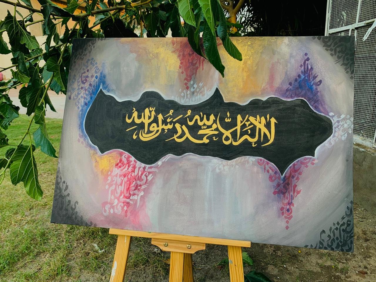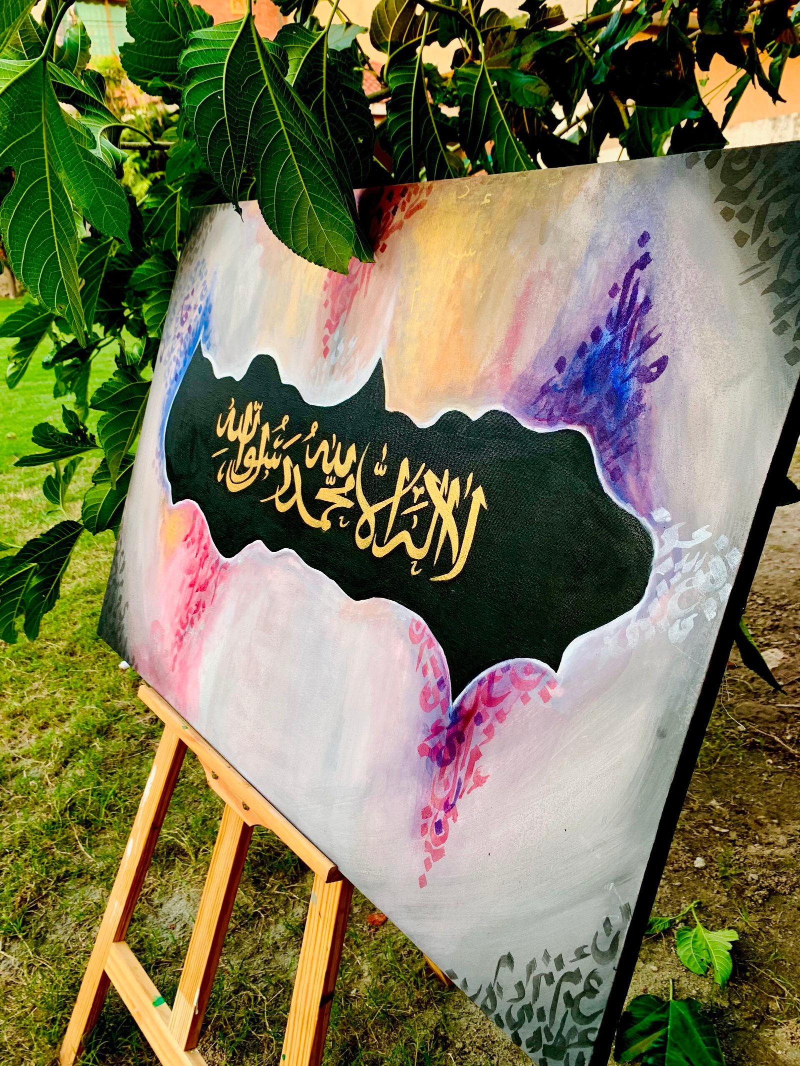 This painting centers the declaration of faith in elegant gold Arabic calligraphy, surrounded by a thoughtfully layered background that enhances the sacred text without overpowering it. The contrast between the dark central form and the softer surrounding tones draws the eye inward, emphasizing meaning, reverence, and balance.