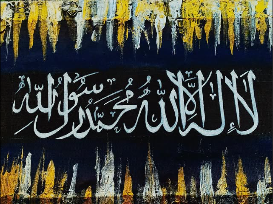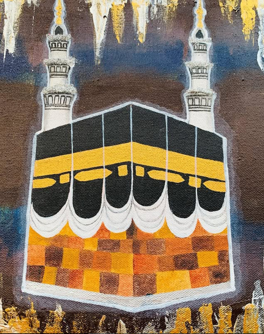A striking Islamic calligraphy painting featuring the sacred words “La Ilaha Illallah, Muhammadur Rasulullah” alongside the Kaaba and Masjid Nabawi, representing faith and devotion.