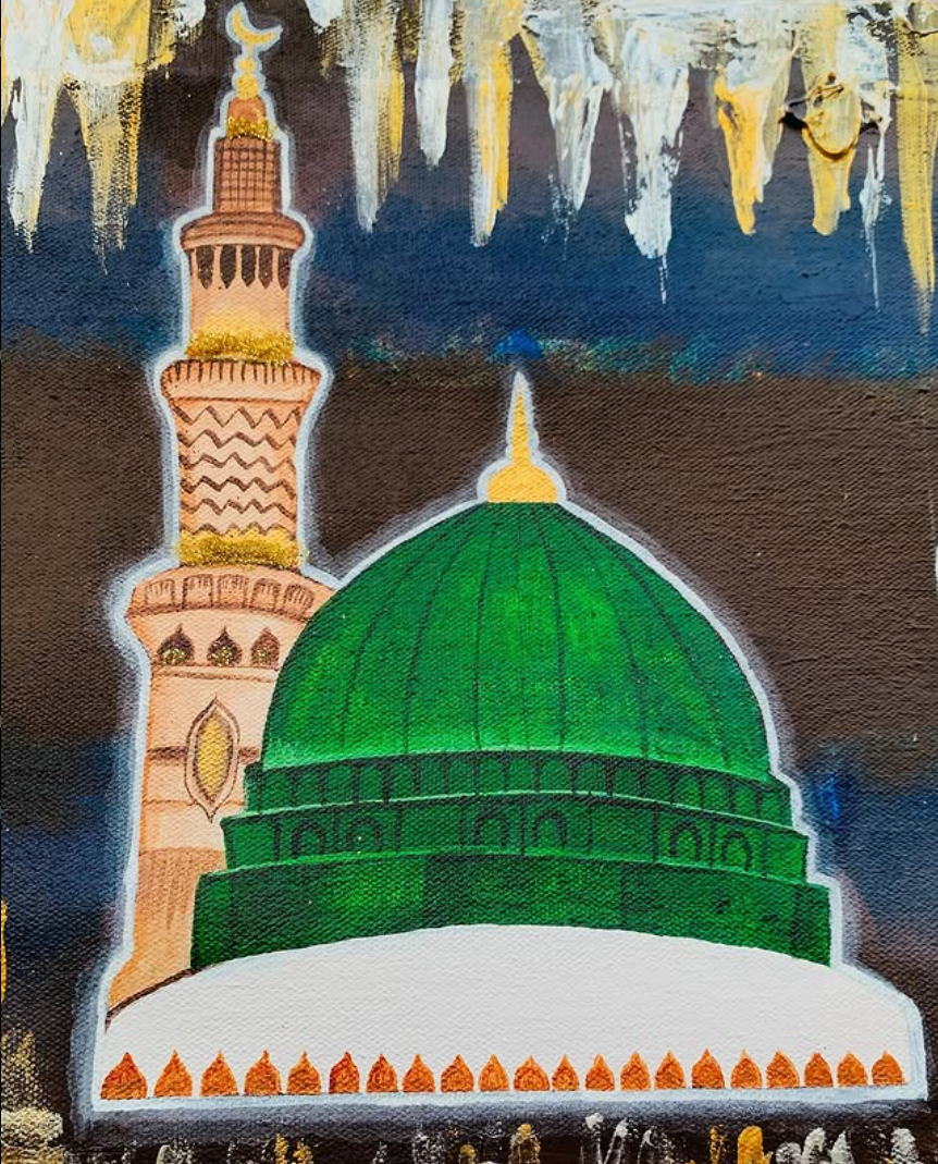 This breathtaking Islamic artwork showcases the powerful declaration of faith, “La Ilaha Illallah, Muhammadur Rasulullah” (There is no god but Allah, and Muhammad is His Messenger), elegantly inscribed between two of Islam’s holiest sites—the Kaaba and Masjid Nabawi. The textured background and golden accents add depth and dimension, while the contrast of dark and light hues creates a captivating visual effect. A meaningful masterpiece for any home, mosque, or Islamic space, this painting serves as a daily reminder of faith and devotion.